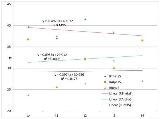 Time dependences of the relative ratios of theta, alpha, and beta rhythms calculated according to Equation (1) during listening to a story. RThetaS—the relative contribution of the theta frequency range to the total signal during listening to a story; RAlphaS—the relative contribution of the alpha frequency range to the total signal during listening to a story; RBetaS—the relative contribution of the beta frequency range to the total signal during listening to a story; Linear (RThetaS)—linear approximations of RThetaS; Linear (RAlphaS)—linear approximations of RAlphaS; Linear (RBetaS)—linear approximations of RBetaS.