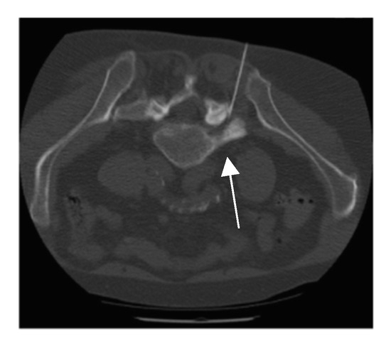 Computed tomography showing the positioning of the spinal needle lateral to the midline at the level of the affected nerve root via a transforaminal approach at the L5/S1 neuroforamen (white arrow).