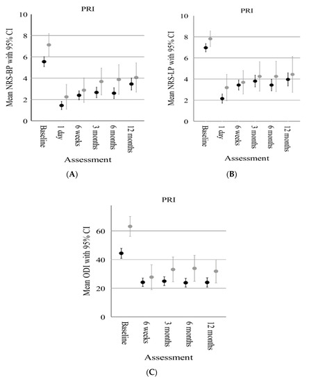 Comparison of the clinical outcome scores between depressed (grey dots and bars) and nondepressed (black dots and bars) patients following PRI over the follow-up period. (A) Comparison of mean NRS–Back Pain (BP). (B) Comparison of mean NRS–Leg Pain (LP). (C) Comparison of mean pain-related functional impairment (Oswestry Disablity Index—ODI). Whiskers represent the 95% confidence interval.