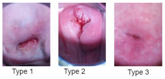 A sample of three different types of cervical pre-cancerous conditions from the dataset [15]. Type 1: Cervical intraepithelial neoplasia (CIN), Type 2: Squamous intraepithelial lesion (SIL), Type 3: Dysplasia.