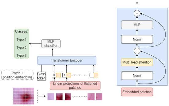 One notable contribution in this area is the Vision Transformer (ViT) introduced by Dosovitskiy et al. [32], which partitions images into patches that are treated as tokens and converted into embeddings to be processed by a transformer encoder. This approach allows models to learn image structure independently, and class labels for the image can be predicted [32,33]. The ViT encoder consists of several blocks, each with a normalization layer to adjust to training image differences, a multi-head attention layer to create attention maps, and a multi-layer perceptron (MLP) to process the embeddings. The last MLP block, known as the MLP head, produces the output, which can be subjected to Softmax to produce the probabilities of the categorization labels [34].