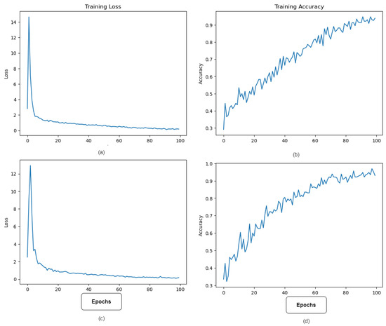 Accuracy and loss variations during the training process. (a,b) show the loss and accuracy variations over the number of epochs of the ViT model, while (c,d) show the loss and accuracy change in the improved ViT with SPT.