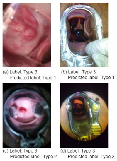 A sample of incorrectly predicted type 3 colposcopy images: (a) Type 3 image predicted as Type 1, (b) Type 3 images predicted as Type 1, (c) Type 3 images predicted as Type 2, (d) Type 3 images predicted as Type 2.