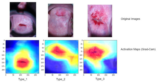 The Grad-CAM technique, based on the ViT with SPT (Shifted Patch Tokenization), was utilized to obtain localizations on testing cervical colposcopy images. In the presented visualizations, the first row showcases the original images, while the second row displays the corresponding classification activation maps overlaid on the images. These activation maps highlight the regions within the images that contributed most significantly to the classification decision made by the model. The colors in a Grad-CAM heatmap usually range from red-to-blue color scale, where red signifies the highest importance and blue signifies the lowest importance. The intensity of the color represents the degree of importance.