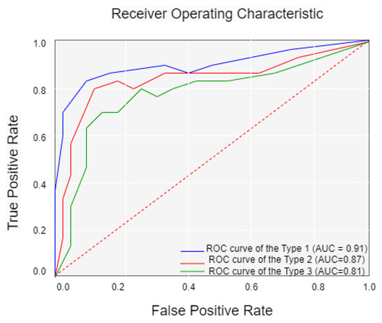 Receiver operating character (ROC) and area under curve (AUC) of the three cervical colposcopy types.