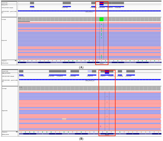 Examples of the detected mutations are highlighted in red (visualized using the Integrative Genomics Viewer): (A) c.1633G > A p. (Glu545Lys) in exon 10 of the PIK3CA gene. (B) c.3140A > T p. (His1047Leu) in exon 21 of the PIK3CA gene.
