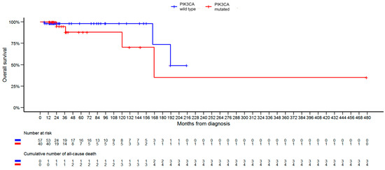 The starting point for the OS and PFS analyses was the histopathological confirmation of the diagnosis. The endpoint for OS was the patient’s death from any cause, and for PFS it was death from any cause, occurrence of metastasis, or recurrence of disease. Patients previously diagnosed with another neoplastic disease before BC were excluded from the OS and PFS analyses; this resulted in the exclusion of 4 patients—2 from the PIK3CA-WT group and 2 from the PIK3CA-M group. The statistical analysis was performed using the R software package, version 4.0.3.
