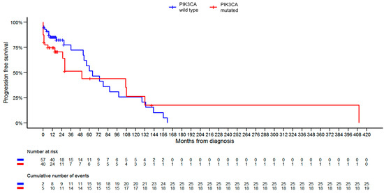 Although PIK3CA has become a firmly established treatment target, controversies linger regarding the effect of the mutation on BC progression [25,26]. While this alteration has been associated with worse progression-free and overall survival, questions remain about the mutation’s heterogeneity [27,28,29,30]. In this paper, we explore the clinical landscape of 100 PIK3CA-positive breast cancer patients, as identified by next-generation sequencing. The aim of this analysis is to compare the baseline characteristics of patients’ and tumors’ features, overall survival, and progression-free survival between PIK3CA-mutated and PIK3CA-wild-type groups.