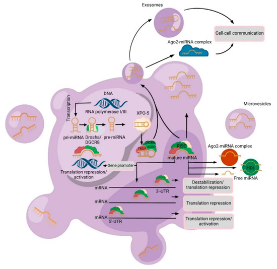 A schematic biogenesis pathway, function, and mechanisms of secretion of microRNA (miRNA). MiRNA biogenesis begins in the nucleus where miRNA genes are transcribed as primary miRNAs (pri-miRNAs) by RNA polymerase II/III. Pri-miRNAs are processed by the RNase III endonuclease and Drosha/DGCR8 complex into precursor miRNAs (pre-miRNA). Then, these pre-miRNAs are exported to the cytoplasm by Exportin 5 (XPO5) and further processed by DICER, a Ribonuclease III enzyme that produces the mature miRNA. Mature miRNAs are incorporated into an RNA-induced silencing complex (RISC), which contains DICER and Argonaute 2 (Ago2) proteins, to produce target mRNA degradation/translational repression/activation. MiRNAs can be secreted from cells into biofluids via the following mechanisms: (1) via extracellular vesicles (EVs) (exosomes or microvesicles (MVs)); (2) as an Ago2-miRNA complex (which represents 90% of cell-free miRNAs) and in the high-density lipoprotein (HDL) complex; and (3) passive secretion through apoptosis or necrosis (free miRNAs).