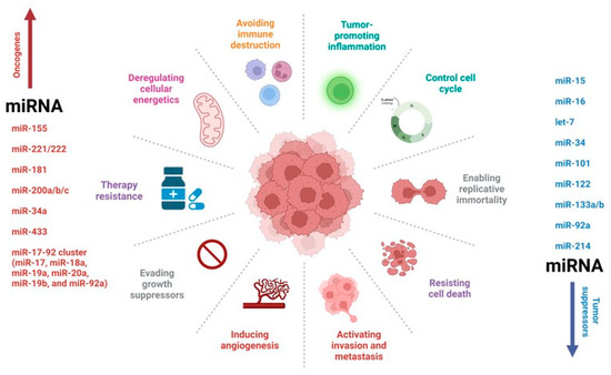 This interaction leads to a reduction in protein production either by obstructing the translation process or promoting the degradation of the target mRNA. An estimated 60% of human genes are directly regulated by miRNAs. Furthermore, certain miRNAs can associate with more than one mRNA target, at times within the context of the same signaling pathway. Conversely, specific mRNAs can encompass multiple distinct miRNA-binding regions within their 3′ UTR, adding layers of regulatory complexity [9]. Consequently, miRNAs serve as fine tuners of gene expression in response to abnormal cellular cues (Figure 2). For instance, C. Sippl and colleagues analyzed the change in expression levels of miR-21, miR-24, and miR-26a in tumor specimens of 104 patients with glioblastoma and 8 specimens of non-neoplastic brain tissue from the control group [10]. In their study, they demonstrated that miR-26a and miR-21 were significantly overexpressed in glioblastoma samples. In addition, high expression levels of miR-24 trended for the prolonged overall survival of glioblastoma patients; however, with high expression levels of miR-26a, a significantly prolonged progression-free survival was evident.