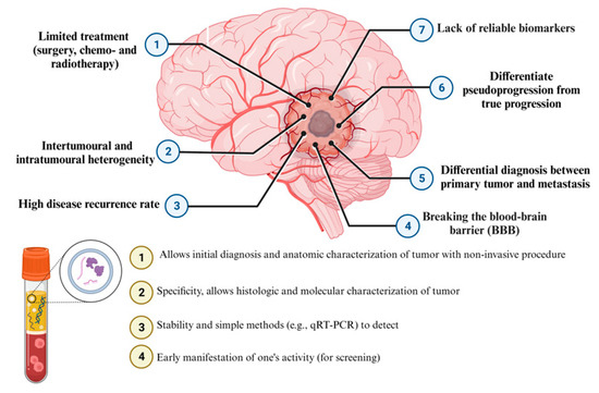 The role of diagnosis in predicting outcomes and guiding optimal treatment selection for brain tumors is of paramount importance. Despite significant recent progress in diagnosing brain tumors using diverse modifications of visualization methods followed by subsequent histopathological analysis, the identification of tumors still faces limitations related to tumor size, location, and the heterogeneous composition of their tissue [3]. As a result, the development of innovative diagnostic strategies is necessary, ones that can synergize with existing techniques to enhance diagnostic precision. A highly promising approach for diagnosing a multitude of tumors is liquid biopsy, which involves the identification and quantification of various cell-free biomolecules in human body fluids, such as blood or cerebrospinal fluid (CSF) (Table 1) [4,5,6,7,8].