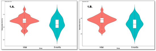 In addition, there were greater values at 6 months of the following parameters: base CS, apical CS, and apical RS (at inclusion: −10.80 (−13.40, −6.40), −11.70 (−16.40, −8.80), and 21.00 (13.00, 31.20), respectively, and −11.40 (−14.20, −9.40), −13.20 (−18.45, −9.50), and 24.33 (16.10, 40.05), respectively, at 6 months) (p = 0.004, p = 0.033, and 0.009).