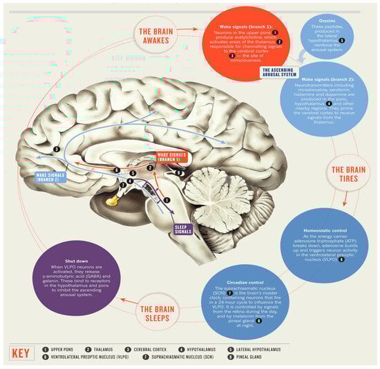 - Brown, R.E.; Basheer, R.; McKenna, J.T. Control of Sleep and Wakefulness. Physiol. Rev. 2012, 92, 1087–1187. [Google Scholar] [CrossRef]