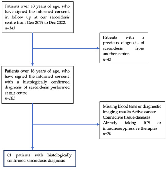 We excluded subjects with insufficient clinical information (i.e., age at diagnosis and smoking habit), missing blood tests or diagnostic imaging results, active cancer and connective tissue diseases, or patients who, for other reasons, were already receiving steroid therapy or another type of specific immunomodulatory therapy at the time of diagnosis. We excluded patients who came to our center with an already-known diagnosis of sarcoidosis. Furthermore, the patients we have included can be defined as ‘naïve’, i.e., without an established diagnosis. Inclusion criteria were also having been diagnosed with sarcoidosis [7] at our center, being 18 years or older, and volunteering to participate. The patient selection process is illustrated in the PRISMA diagram in Figure 1.