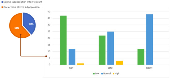 Analyzing the values at flow cytometry showed that 21 patients (26%) had lymphopenia with total lymphocyte counts <1000 cells/µL. Twelve of these patients (57%) had low CD4+ (<500 cel/µL), CD8+ (<350 cells/µL), and CD19+ (<140 cel/µL) lymphocyte counts. Furthermore, 38 patients (47%) showed low levels of CD4+, 22 patients (27%) had low blood levels of CD8+, and 19 patients (23%) had low CD19+. More data about cytometry analysis are shown in Table 4 and Figure 2.