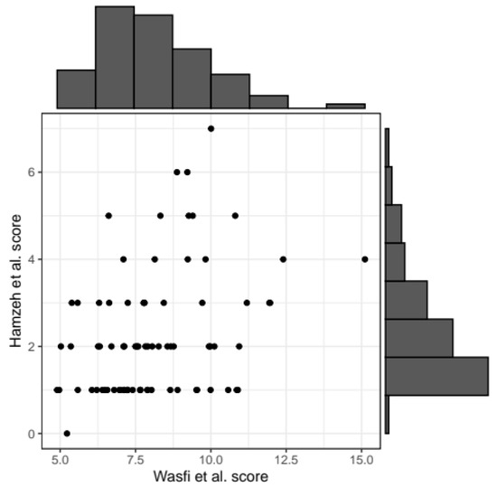 Scatterplot representing the correlation between the two scores. Black points correspond to patients’ values for the two scores. Histograms summarizing the distribution of Wasfi et al. [24] score (x-axis of scatterplot) and Hamzeh et al. [25] score (y-axis) are reported on the horizontal and vertical axis, respectively.