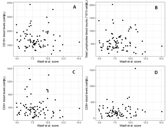 We then calculated the correlation between the Wasfi et al. [24] score and blood levels of total lymphocytes and then with the subpopulation of CD4+, CD8+, and CD19+, as shown in Figure 4. None of the associations resulted statistically significant, not even at a suggestive level. The correlation between the severity score and total lymphocytes shows a r = −0.086 (p-value = 0.44). We then calculated the correlation with the level of CD4+ which results in r = 0.028 (p-value = 0.80), CD8+ with r = −0.113 (p-value = 0.31), and CD19+ with r = 0.045 (p-value = 0.44).