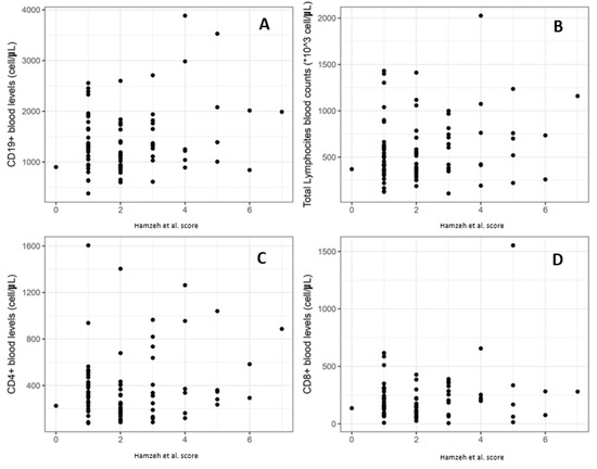 Correlation between Hamzeh et al. [25] severity index score (x-axis of graph) and total lymphocyte count (A), CD4+ blood levels (B), CD8+ (C), and CD19+ (D).