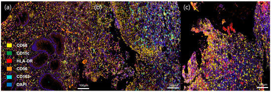 Representative images of multispectral immunohistochemical staining in panel 1 (20×). (a) CD. (b) Intestinal BD. (c) Intestinal TB.