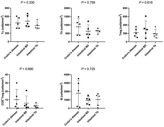 Comparison of immune cell densities between CD, intestinal BD, and intestinal TB in panel 1. Abbreviations: Tc, cytotoxic T cell; Th, helper T cell; Treg, regulatory T cell.