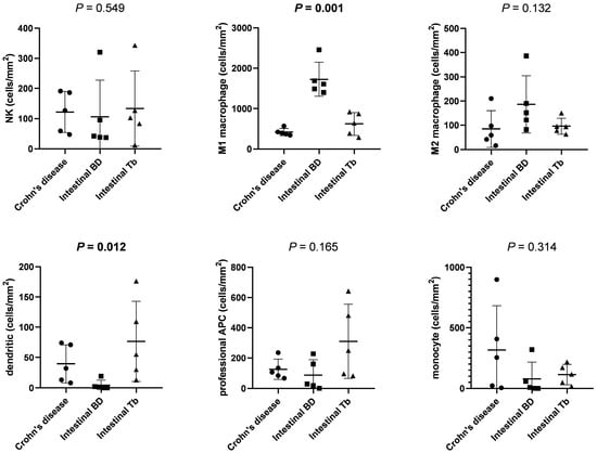 Comparison of immune cell densities between CD, intestinal BD, and intestinal TB in panel 2. The densities of M1 macrophage and dendritic cells were significantly different between the three groups. Abbreviations: NK, natural killer cell; APC, antigen-presenting cell.
