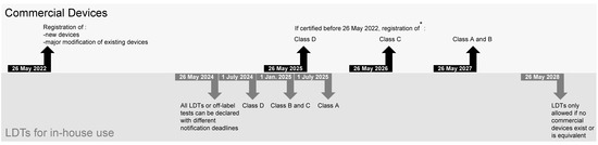 Concerning in-house IVDs, also known as laboratory-developed tests (LDTs), their definition, use, and obligation of notification are defined in article 5.5 of the IVDR and articles 9 and 10 of the IvDO. Any test is considered to be LDT when developed and validated according to the EN ISO 15189 norm in a health institution, or any CE-marked commercial test used off label, meaning not precisely following the manufacturer’s recommendations. Thus, for example, the use of CE-IVD tests on other sample types and/or another population from the one(s) listed in the certification are considered off label. Similarly, any modification of the interpretation thresholds or of the manufacturer’s instruction for use defines the test as off label (see Table 2). All LDTs or off-label tests will be submitted to the IVDR/IvDO from 26 May 2024 with different notification deadlines according to the IVD class, i.e., 1 July 2024 for class D, 1 January 2025 for classes B and C, and 1 July 2025 for class A, according to article 90 paragraph 3 of the IvDO (Figure 1). In addition, as of 26 May 2028, to continue using their LDTs, healthcare institutions will have to demonstrate that there is no CE-IVD test with equivalent performance (article 82, paragraph 4 IvDO) or to justify the application of the LDT (Figure 1). In addition, this will have to be demonstrated regularly. This concerns tests that are assumed to be equivalent, such as the use of a home-made database versus a manufacturer’s database on a MALDI-ToF. In no case is this required if the technique used is technically superior to another, typically in cases such as the sequencing of strains versus identification using various biochemical tests.