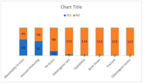 A total of 61 patients were diagnosed with mucosal thickening (52.1%). The sinus wall most affected by mucosal thickening was the maxillary sinus floor, followed by the medial and lateral walls of the maxillary sinus. Of the 19 patients with odontogenic conditions causing periapical lesions, 15 had maxillary sinus mucosal thickening, and the relation was statistically significant (p = 0.004). The odontogenic cyst was diagnosed in five patients (4.3%), while a sinus wall fracture was recorded in two patients (1.7%). Maxillary sinus hypoplasia was diagnosed in three patients (2.6%). We did not observe any significant difference between the periapical grade and the occurrence of maxillary sinusitis, even though we had five cases of Grades 2 and 3, which meant that in five cases, there was a periapical region close to the maxillary sinus, which could induce a change in the latter. The frequency of the pathologies is represented in Figure 5.