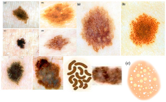 A visual example of five differential structures present in skin lesion: (a) pigmented networks; (b) globules patterns; (c) streaks patterns, (d) negative network; (e) milia-like cysts.