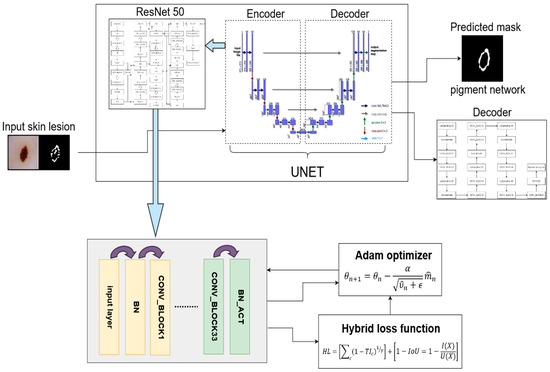 In this section, we have given an overview of our proposed Dermo-Seg model. The attribute-level segmentation of skin cancer lesion is a very challenging task due to the presence of similar or overlapping structures within in them. To meet this challenge, we have proposed a novel attribute segmentation method for skin lesions using the proposed hybrid loss function. The overview of the proposed model is shown in Figure 5. The proposed model is made up of two parts, an encoder and a decoder, which is like the original UNet [68]. The encoder part is replaced by ResNet-50 architecture [45]. The ResNet-50 is used as a backbone in UNet architecture. There are some variations that have been made in the original ResNet-50 architecture to make it work better and more efficiently in our case of skin lesion attribute segmentation... The ResNet-50 encoder part down-samples the input image of the skin lesion. After that, the decoder part up-samples the pixels.