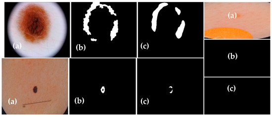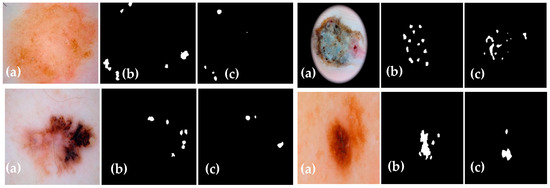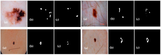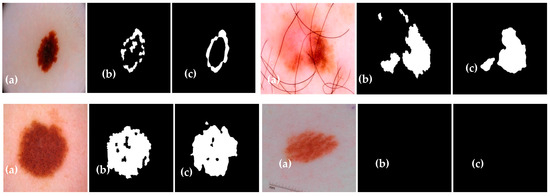 A Mask R-CNN-based technique [14] proposes candidate object bounding boxes and binary mask prediction for skin lesion segmentation. A combination of YOLOv3 and the GrabCut algorithm [15] is utilized for effective lesion segmentation. A lesion segmentation methodology inspired by the pyramid scene-parsing network [16] uses an encoder–decoder system with pyramid pooling blocks and skip connections. DeepLabv3+ and Mask R-CNN [18] are used for accurate lesion localization. Deep learning methods [19] combine pre-trained VGG16 [61], DeeplabV3 [62], SegNet decoder [63], and TernausNet [64] for skin lesion segmentation. U-net frameworks [20] and a modified U-Net framework obtain an effective lesion segmentation. A dense deconvolutional framework [21] addresses the challenges of changing size and appearance in skin lesion segmentation.