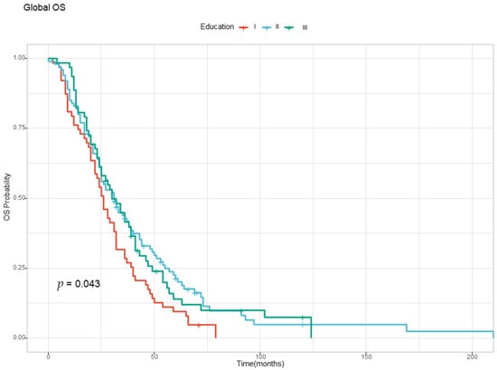The OS analysis found no differences based on sex, age, and urban versus rural background, but education levels influenced survival, as depicted in Figure 2. The patients were divided into three subgroups, based on their level of education (i.e., Level I—primary and secondary school, Level II—high school, Level III—university and post university studies). Patients with Level I education (primary and secondary school) had the worst prognosis, with a median OS of only 26 months (Figure 2 and Table 3).