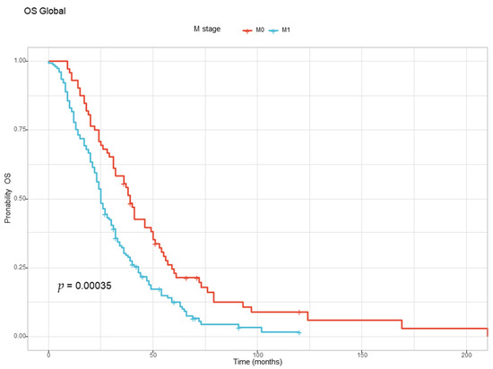 The correlation between metastatic stage at diagnosis and OS was also analyzed. The patients with metastatic disease at diagnosis (M1) had a worse prognosis than the patients that were free of metastasis at diagnostic (M1) and developed metastatic disease later, as illustrated in Table 8 and Figure 3 below.