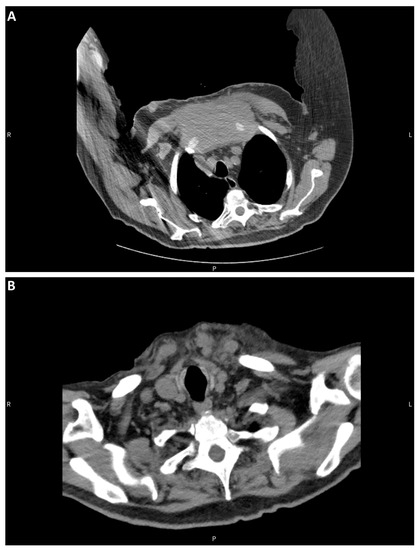 CT of the chest and neck. (A) Sternal mass. (B) Atrophic thyroid bed.