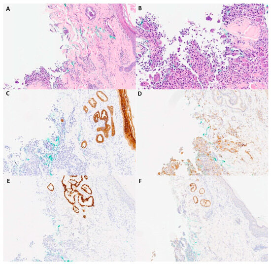 Microscopic and immunohistochemical examination of skin biopsy. (A) H&E-staining (40×) image with foci of papillary and multinucleated giant-cell neoplasms. (B) Higher-power H&E-staining image (100×) of poorly differentiated neoplasm foci. (C) AE1/AE3 (40×). (D) CD68 (40×). (E) TTF-1 (40×). (F) PAX-8 (40×).