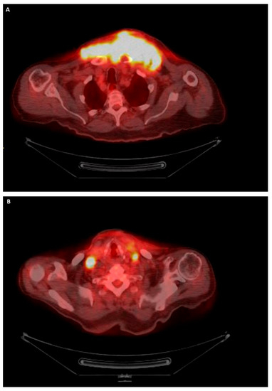PET/CT of the whole body was performed to show how the neoplasm had grown to 15.2 cm (12 cm in the previous CT scan one month earlier, Figure 4A). Cervical and axillary lymphadenopathy was also observed (Figure 4B). The specimen was sent for molecular testing, which confirmed that the tumor harbored the BRAF V600E mutation. The patient died approximately six months after the primary pathological diagnosis.