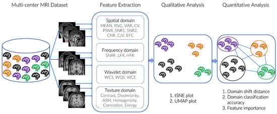 Addressing the challenges of domain shift in multi-site MRI datasets requires advanced techniques and methodologies. Domain adaptation (DA) [7,8] and harmonization [9] methods aim to bridge the gap among different domains by aligning and normalizing the data from different centers. These approaches involve transforming the data distribution or features to minimize domain-specific variations, enabling more bias-free and reliable analysis across centers. Before developing DA or harmonization algorithms, it is essential to comprehensively understand the nature of domain shift in existing or target datasets. The degree of domain shift in a multi-center MRI dataset is a problem worth investigating and is the principal focus of this article. In particular, we propose a novel framework named DSMRI (Domain Shift analyzer for MRI) to qualitatively and quantitatively determine the degree of domain shift present in an MRI dataset. The proposed framework leverages existing MRI-quality-related spatial domain features as well as introduces frequency, wavelet, and texture domain features to quantify the degree of domain shift. To assess the effectiveness of the proposed framework, we conduct comprehensive experiments with seven multi-site MRI datasets, including participants with amyotrophic lateral sclerosis (ALS), Alzheimer’s disease (AD), Parkinson’s disease (PD), and autism spectrum disorder (ASD) in addition to healthy controls (HC). To foster reproducibility and knowledge sharing, the Python source code of the DSMRI has been made publicly available at https://github.com/rkushol/DSMRI (accessed on 5 September 2023). The applications and benefits of analyzing and dealing with domain shift in multi-center MRI datasets are numerous. Here are some crucial ones: