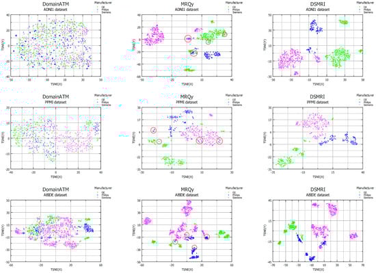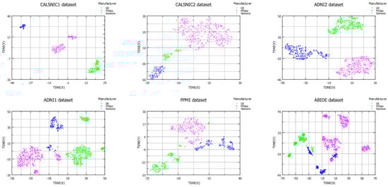 The tools introduced by Sadri et al., MRQy [25], and Guan et al., DomainATM [26], can be considered the two closest studies related to the proposed framework. MRQy is mainly designed for the QC of MRI data by which manual effort to filter poor-quality data can be automated for clinical and research studies. It uses different spatial-domain-image-quality-related metrics to address different types of noise, shading, inhomogeneity, and motion artifacts. Although they provided an example of detecting site effects using their proposed features, when we experimented on large-scale datasets with more scanner/acquisition protocol variations, we noticed that MRQy features could not cluster the data accurately. Secondly, MRQy uses metadata, such as image/voxel dimension from the file header. These features become identical for all the center’s data after commonly used preprocessing steps like skull stripping or registration; hence, they are not fruitful for site effect analysis.