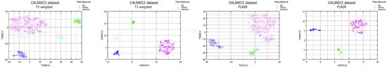 t-Distributed Stochastic Neighbor Embedding (t-SNE) [10]: It is a nonlinear dimensionality reduction technique that maps high-dimensional data to a lower-dimensional space while preserving the local and global structure of the data. It models each high-dimensional data point as a probability distribution in the lower-dimensional space and minimizes the divergence between the probability distributions. In our case, the t-SNE method takes the input of the proposed 22 features and converts them to two-dimensional space for each MRI scan. The sklearn.manifold Python library is used to implement t-SNE with the default settings (n_components = 2, perplexity = 30).