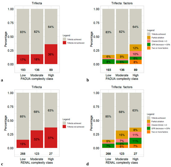 Stacked bar plots depicting trifecta not achieved and factors determining trifecta status distribution according to complexity classes: (a) trifecta status according to PADUA; (b) trifecta factors according to PADUA; (c) trifecta status according to RENAL; (d) trifecta factors according to RENAL.