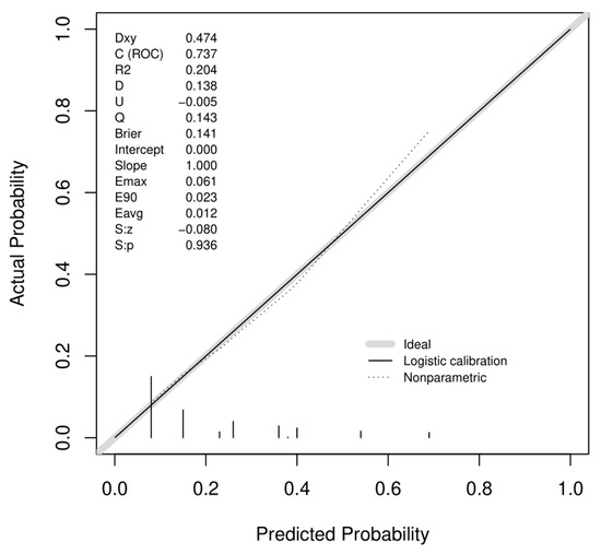 A bootstrapped c-index of 0.74 (0.67–0.79) determines the fair ability of the model to discriminate trifecta status and the calibration plot depicts a good agreement between the observed and predicted outcomes (Figure 2).