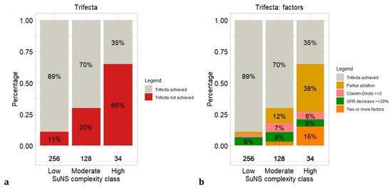 Specifically, the rates of no trifecta achievement were the following: 11 vs. 30 vs. 65% in low (n = 256; 61%) vs. moderate (n = 128; 31%) vs. high (n = 34; 8%) complexity, respectively. Supplementary Table S4 summarizes the percentage of patients, previously scored according to PADUA and RENAL, that were reclassified according to the SuNS score.