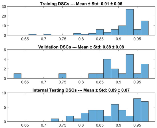 Figure 1. DSCs for the comparison between DL-based macular detector’s predictions and human operator’s manual ROIs, on the training, validation and internal testing sets.