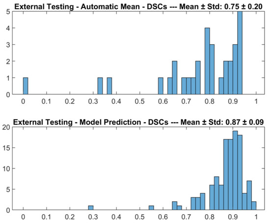 Figure 3. DSCs for the comparison between DL-based macular detector’s predictions and human operator’s manual ROIs, on the external testing, split according to whether the detector failed (above, Automatic Mean) or succeeded (below, Model Prediction) in detecting the macula.