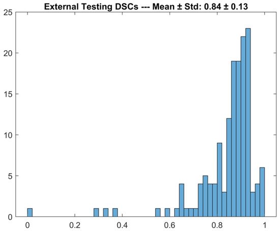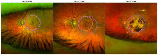 As shown in Figure 2, the detector achieved 0.84 ± 0.13 (mean ± std) DSC on the external testing set. As shown in Figure 3, the detector failed to identify the macula in 31/151 cases (21%); in such cases, the mean position calculated on the training set was used, achieving 0.75 ± 0.20 (mean ± std) DSC.