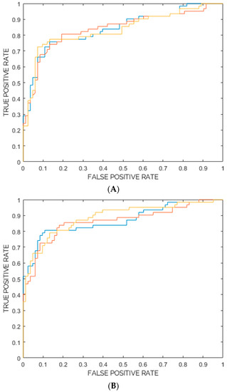 Figure 6. (A) ROC Curve for each of the three ensembles (represented in blue, red and yellow) of random forest classifiers (from Internal Testing). (B) ROC Curve for each of the three ensembles (represented in blue, red and yellow) of support vector machine classifiers (from Internal Testing).