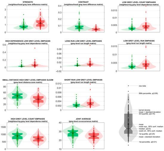 The distribution of the most relevant features in the two classes was presented both numerically, by their medians with 95% CI, and graphically, by the use of violin and box plots for intuitive visualisation and interpretation. For each of such features, the statistical significance in discriminating the two classes was assessed by a non-parametric univariate Wilcoxon rank-sum test (Mann–Whitney U test) [29] with Bonferroni correction [30] and significance levels set at 0.05 and 0.005.
