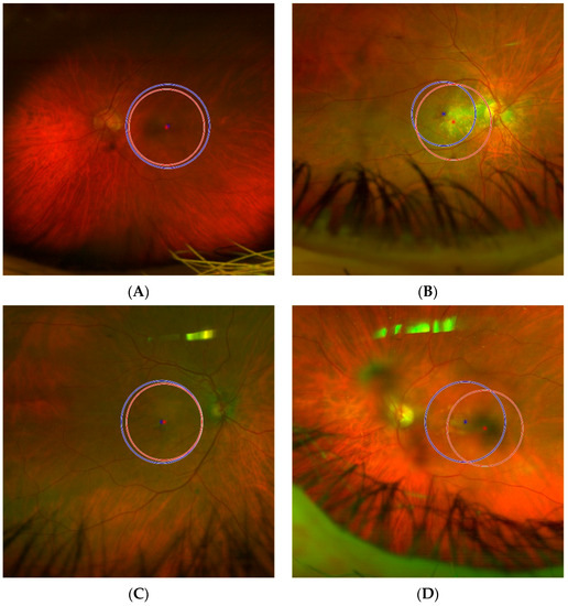 Figure 4. Predictions of the DL-based macular detector, on representative UWF-FRT from the internal testing set. The predictions (in red) are compared with the reference standard human operator’s manual ROIs (in blue).