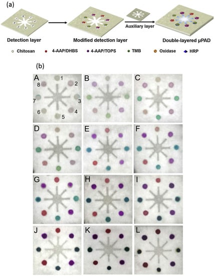- Li, F.; Wang, X.; Liu, J.; Hu, Y.; He, J. Double-Layered Microfluidic Paper-Based Device with Multiple Colorimetric Indicators for Multiplexed Detection of Biomolecules. Sens. Actuators B Chem. 2019, 288, 266–273. [Google Scholar] [CrossRef]