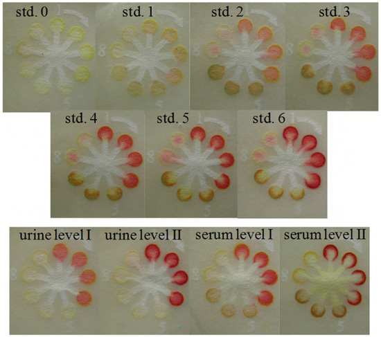 The results of ALT and AST colorimetric assay are quantified by comparing the color density produced by the unknown sample to known standards. Color matching using the naked eye may be complicated by many factors, such as color perception, background lighting, and color differences between the dry-printed guide and the wet-paper device. To bridge the gap, quantitative analysis of the diagnostic test was performed using additional equipment, high-resolution cameras, and scanners. To circumvent these obstacles, multiple indicators for a single analyte generate multiple colors for better visual discrimination. In one study, Dungchai et al. demonstrated semi-quantitative measurement of glucose, lactate, and uric acid in a paper-based microfluidic assay using multiple indicators. In this approach, each indicator reacted to different concentrations of peroxides and exhibited a variable range of colors for the accurate analysis of analytes. The single indicator test had an accuracy of 70%, whereas multiple indicators were over 90% accurate [43]. The combination of more than one indicator with known concentrations was placed in the test zone. Standard color intensities were developed for the specific concentrations of glucose, lactate, and uric acid, as shown in Figure 3. The color intensities of the unknown urine and plasma samples were compared with the standards for the semi-quantitative analysis (Figure 3). Therefore, we suggest a multiple-indicator approach for ALT and AST to further improve the accuracy of the results.