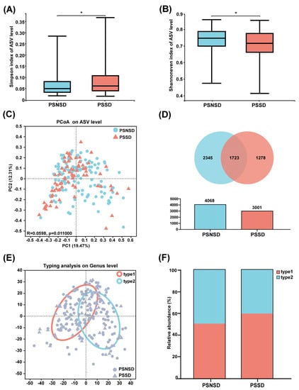 Changes in microbiota diversity and community type in patients with PSSD. (A) Simpson and (B) Shannon even indexes. (C) Principal coordinate analysis (PCoA) plots. (D) Venn diagram of fecal microbiota at the ASV level. (E) The circle colored by enterotype: orange-red color corresponds to enterotype 1 (Escherichia-Shigella) and blue color corresponds to enterotype 2 (Bacteroides). (F) The percentages of enterotype 1 and enterotype 2 in the PSSD and PSNSD samples. *: p < 0.05.